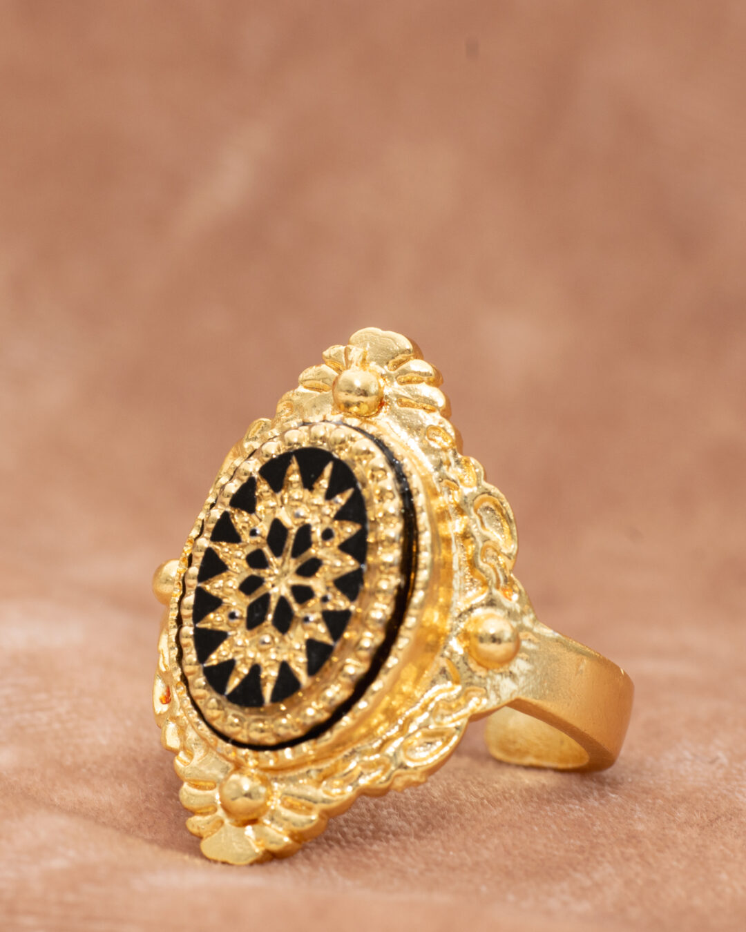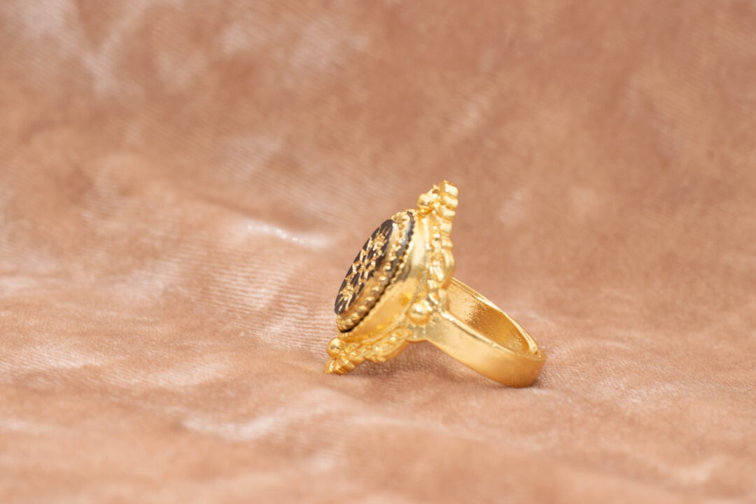 Stunning adjustable ring, built around a 40s Victorian revival glass intaglio, featuring a golden starburst motif carved into the glass and with gold inlays. This is a traditional technique is known as intaglio.