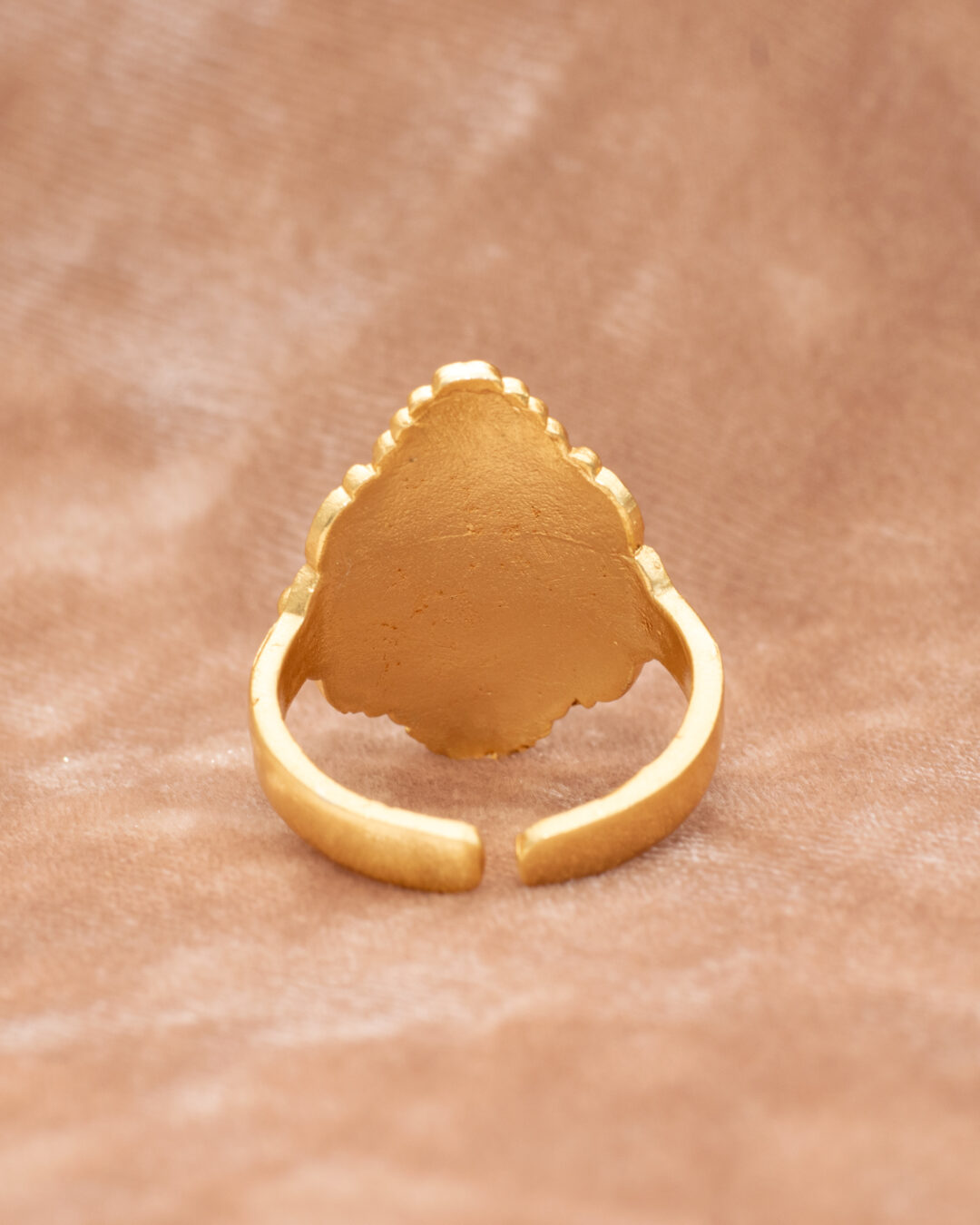 The intaglio cabochon measures 14 x 10 mm and is set into a beautifully ornate gold-plated setting (contemporary, high-quality), evoking old-world elegance and timeless detail.