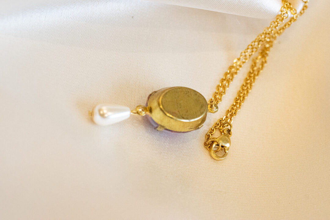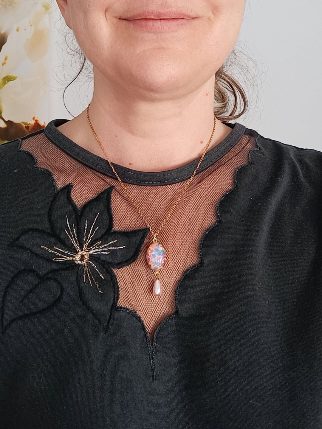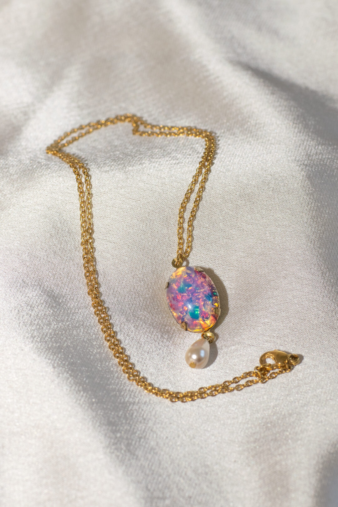 This necklace is crafted with a feel vintage opal glass cabochon which was made by hand in West Germany 60s and glows in soft shades of pink, blue and gold, paired with a delicate teardrop pearl by Preciosa, a high quality glass pearl Cezch brand.