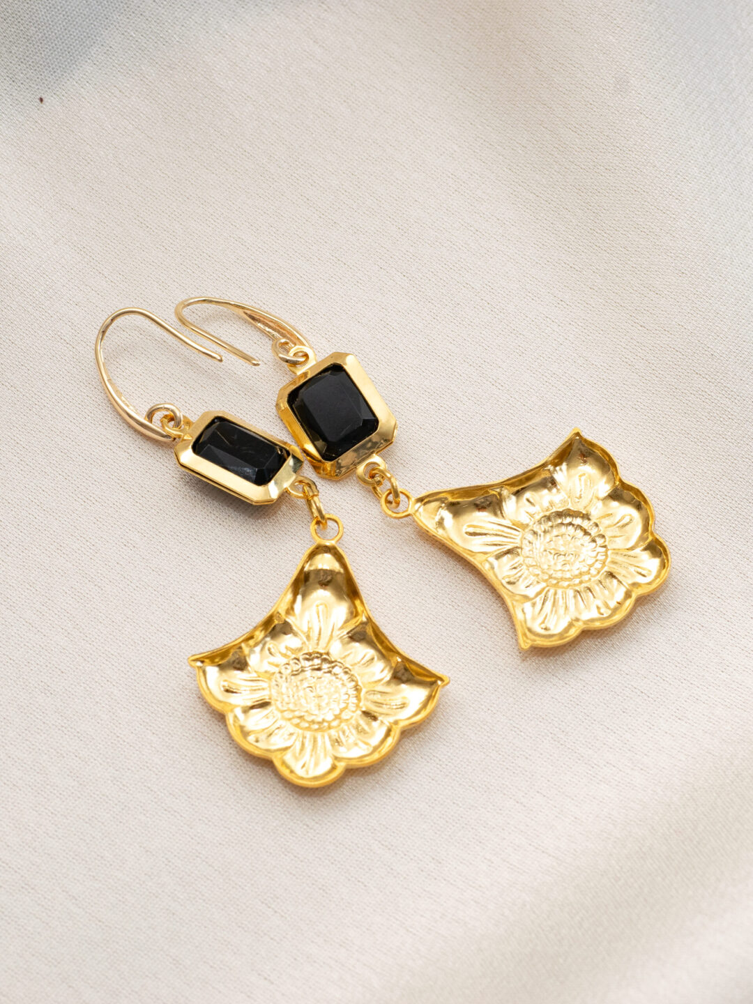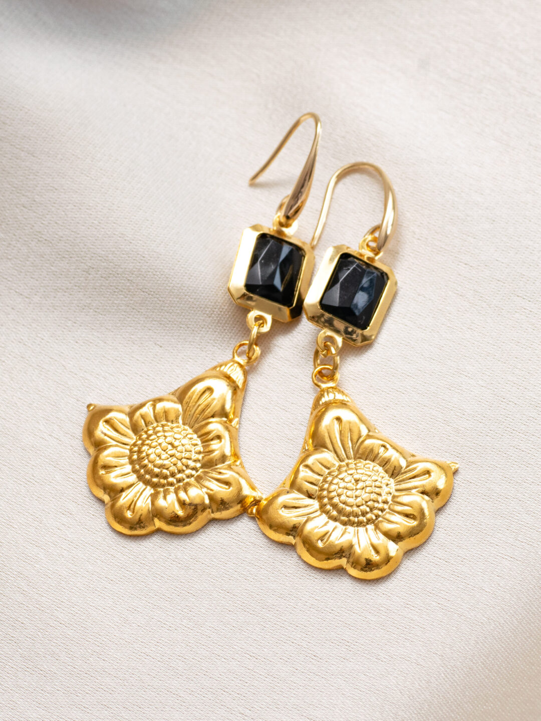 🌻Stunning gold plated flower dangle earrings featuring bold design reminiscent of sunflowers or daisies and accented with a glossy facetted black bead on gold plated setting, which will bring charm and elegance to your look. They are handmade with vintage parts from old wharehouses.