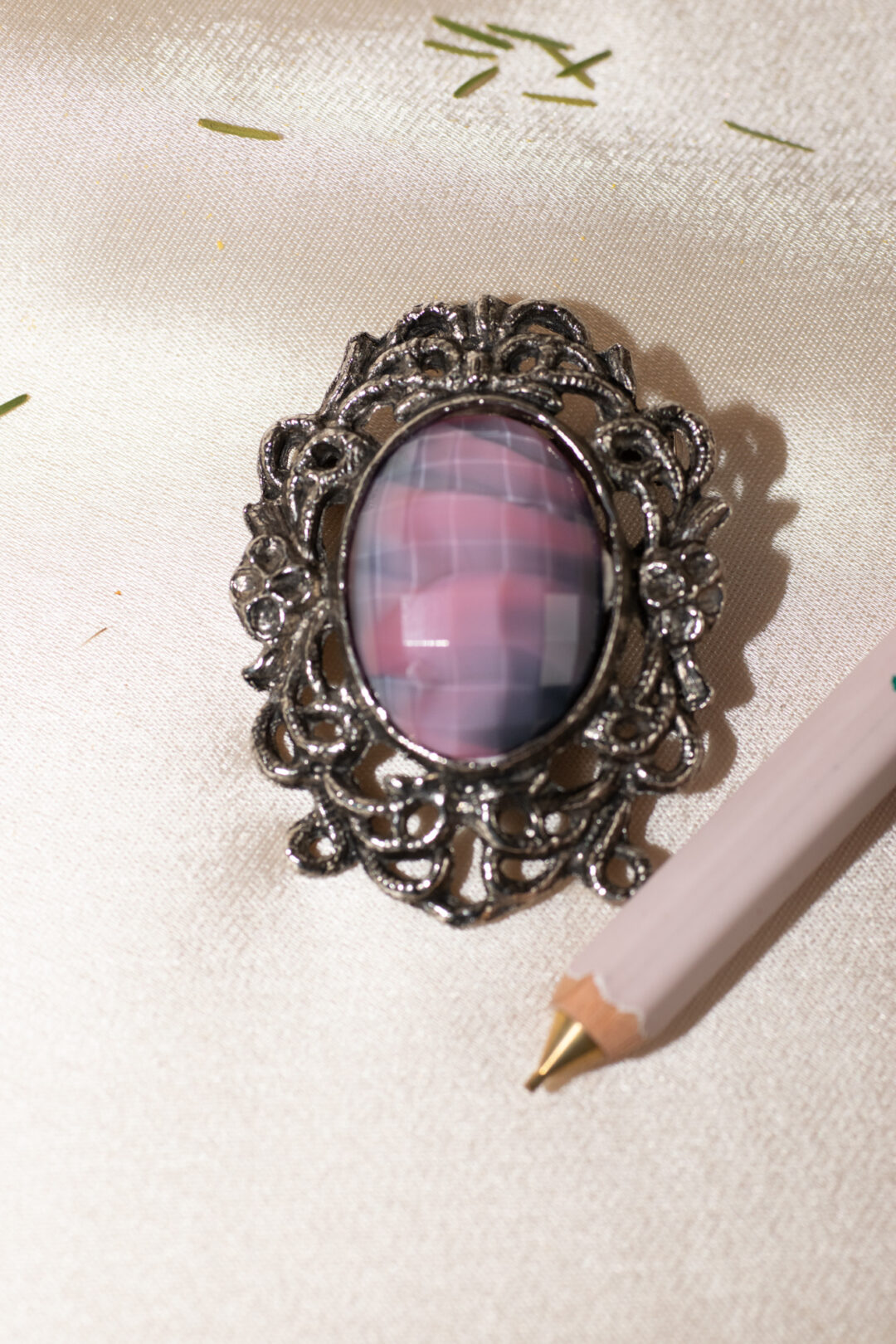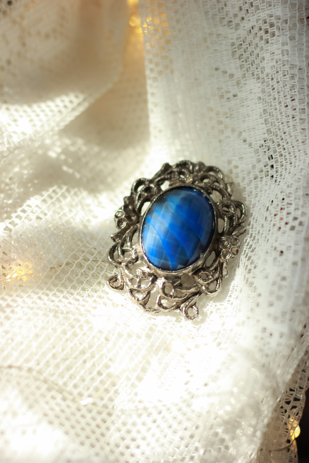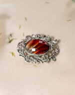 Eye catching vintage Czech glass brooch combining an outstanding 1960s Czech cut cabochon stone, known for its rich hue and inner reflections, and an old silver tone filigree frame handcrafted in the 1950s using a traditional mold which was also made by hand. Delicate streaks of smoky grey and deep black weave through the colour, giving the glass a striking sense of depth and dimension. Each piece has been manually assembled, preserving the artisanal techniques of mid-century European costume jewelry.