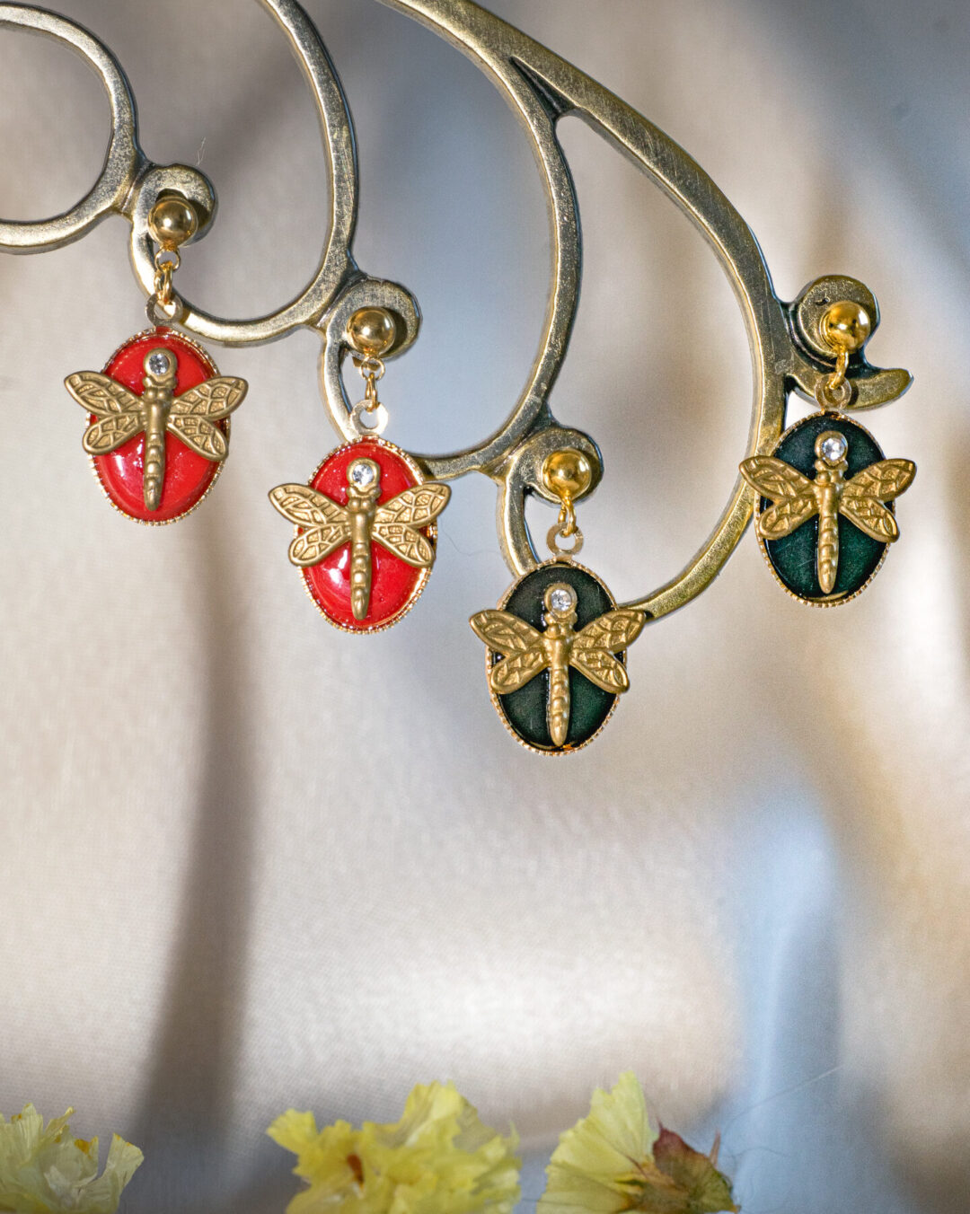 These dragonfly earrings blend whimsy and elegance in a timeless design. Handmade using limited, never-worn vintage components, each pair features a graceful flying dragonfly in raw brass, which has aged with patina as shown, resting on a vintage cabochon: choose from deep red glass or natural black shell.